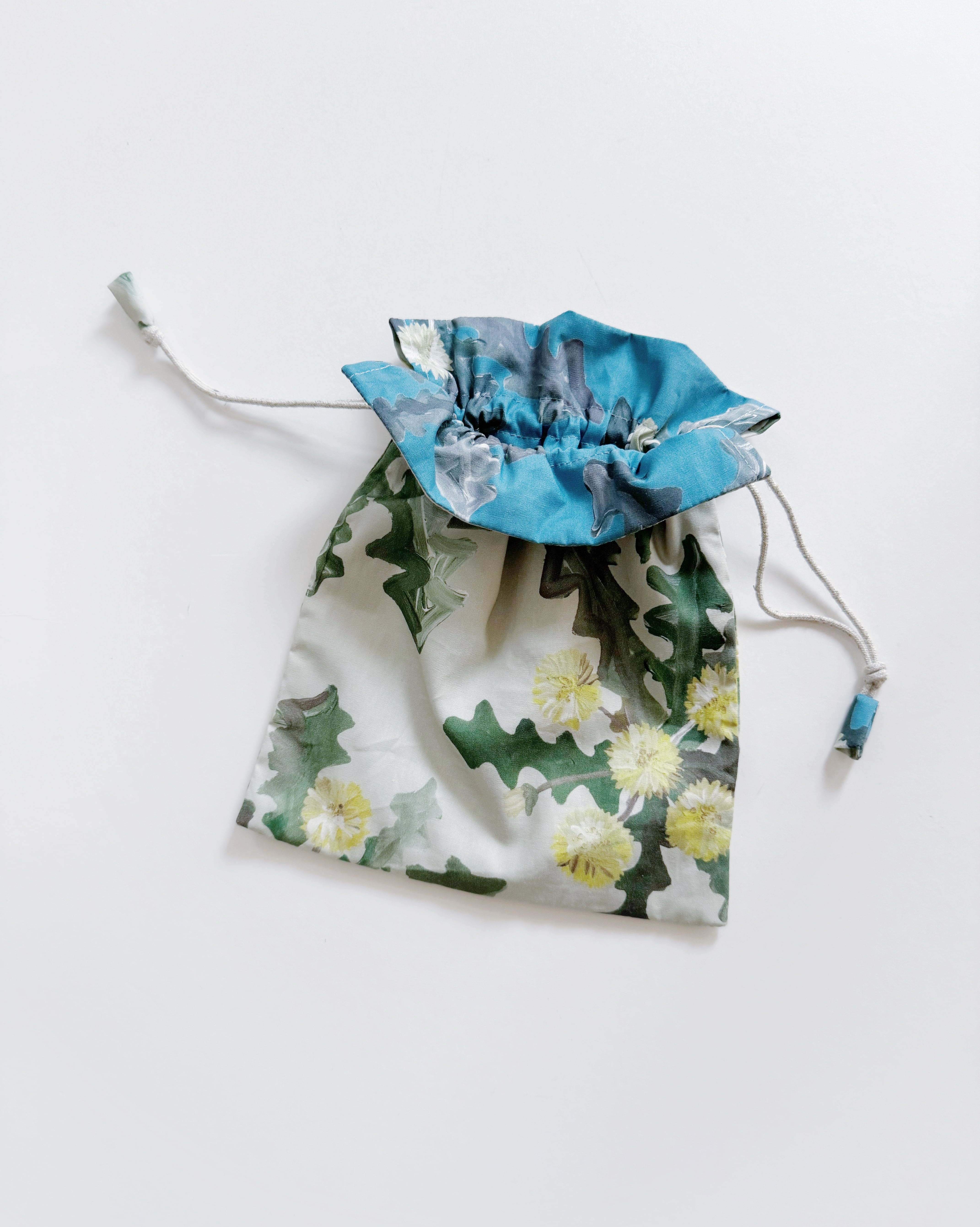 It is a drawstring porch using fabrics drawn with the motif of Dandelion.